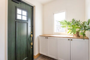 外観にはIG工業の外壁材「ビレクト」を採用。落ち着いた外観の中に、グリーンのドアがアクセントとして映える住まいです。