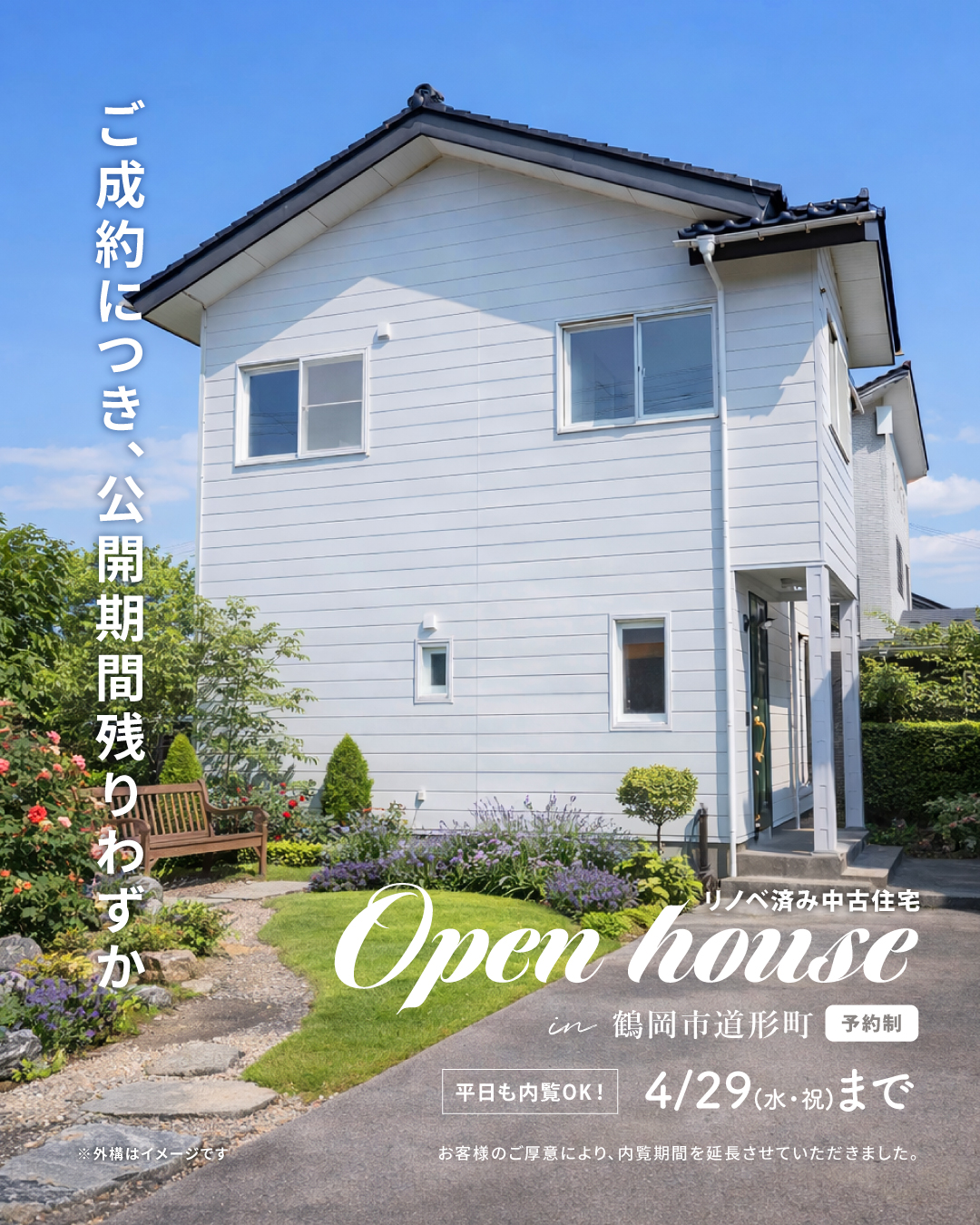 - 上記日程にて、道形町リノベモデルハウスの内覧会を延長開催いたします。 本物件はこのたびご成約となりましたが、お客様のご厚意により引き続きご見学いただけることとなりました。 実際の暮らしをイメージしながらご覧いただける住まいですので、住まいづくりやリノベーション、中古住宅の購入をご検討の方は、ぜひこの機会にお気軽にご見学ください。